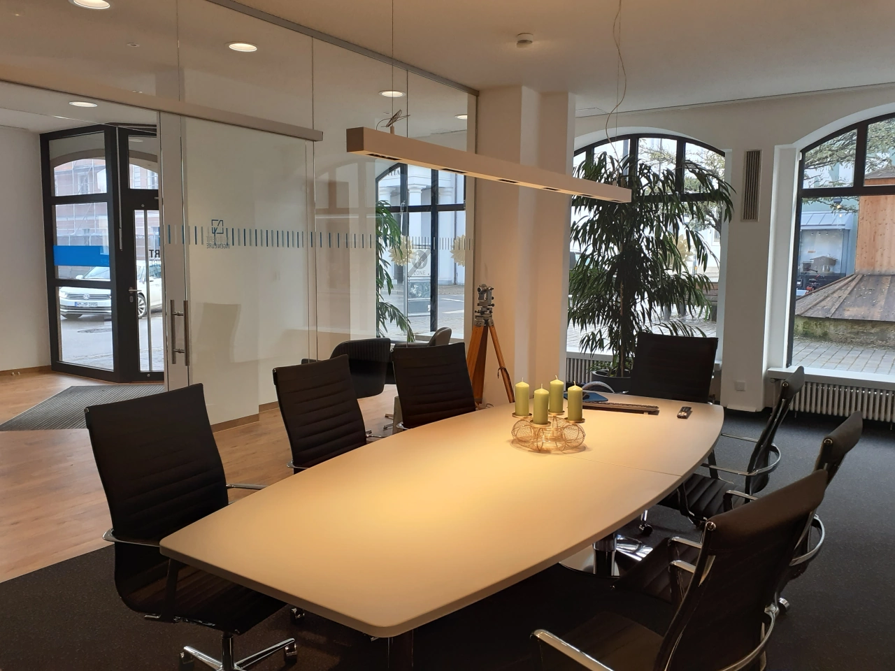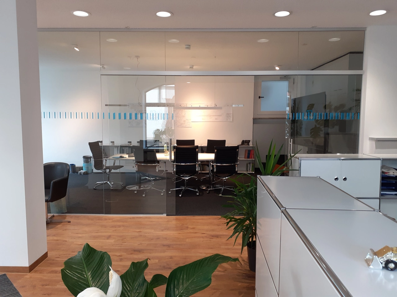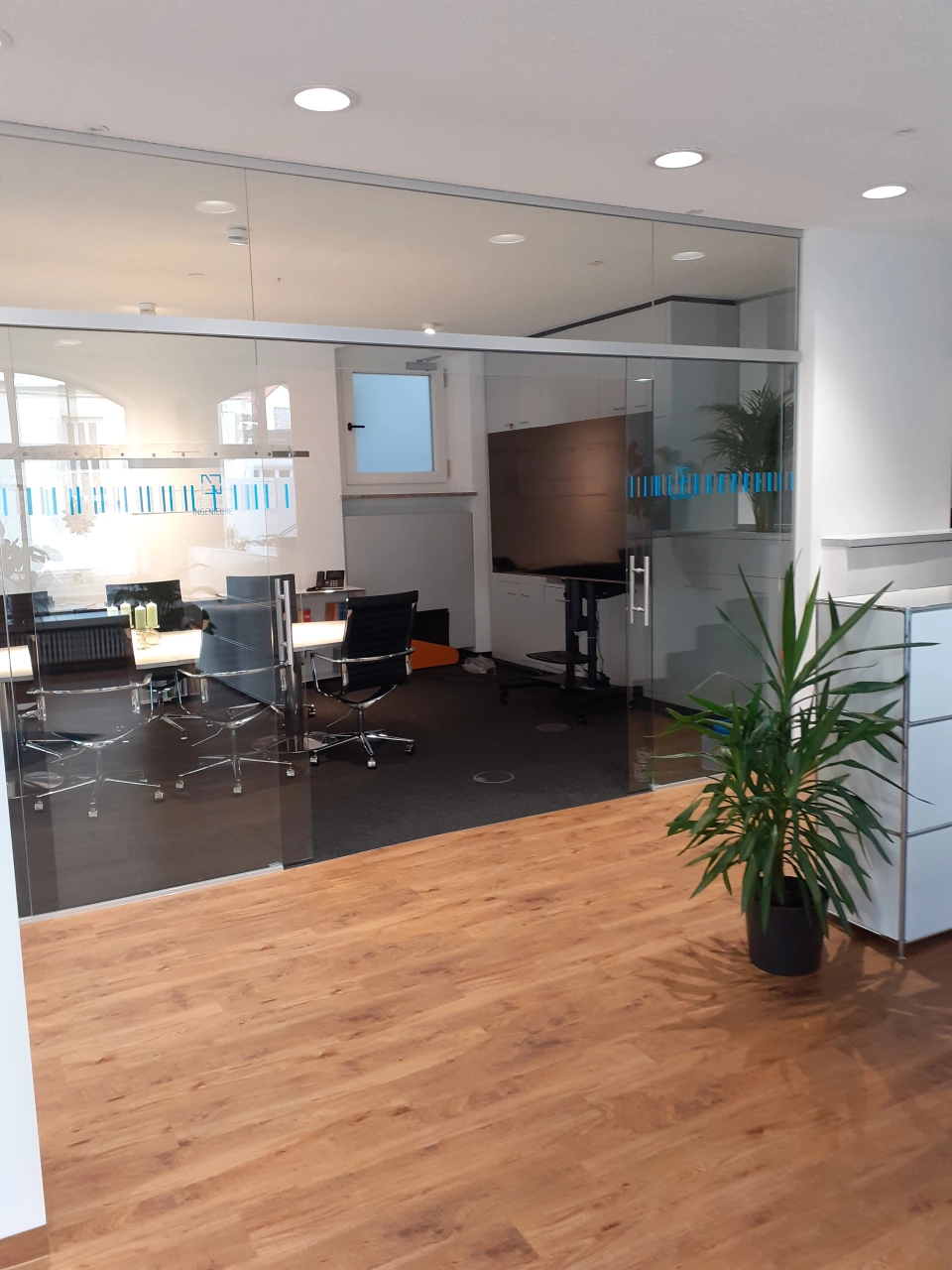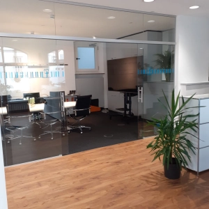 - Glastrennwand (Besprechungsraum) mit einer 2-flügeligen Schiebetüranlage (ca. 7,0 × 2,8 m)