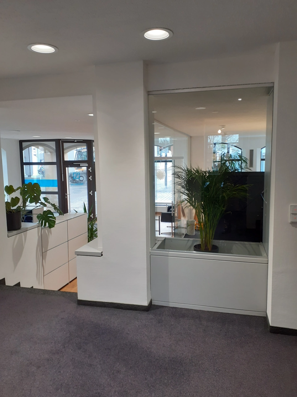 Für einen Gewerbekunden wurden bestehende Büroflächen vollständig modernisiert und in einen zeitgemäßen Arbeits- und Besprechungsbereich umgewandelt – inklusive neuer Eingangssituation, Glastrennwand und erneuerter Haustechnik.