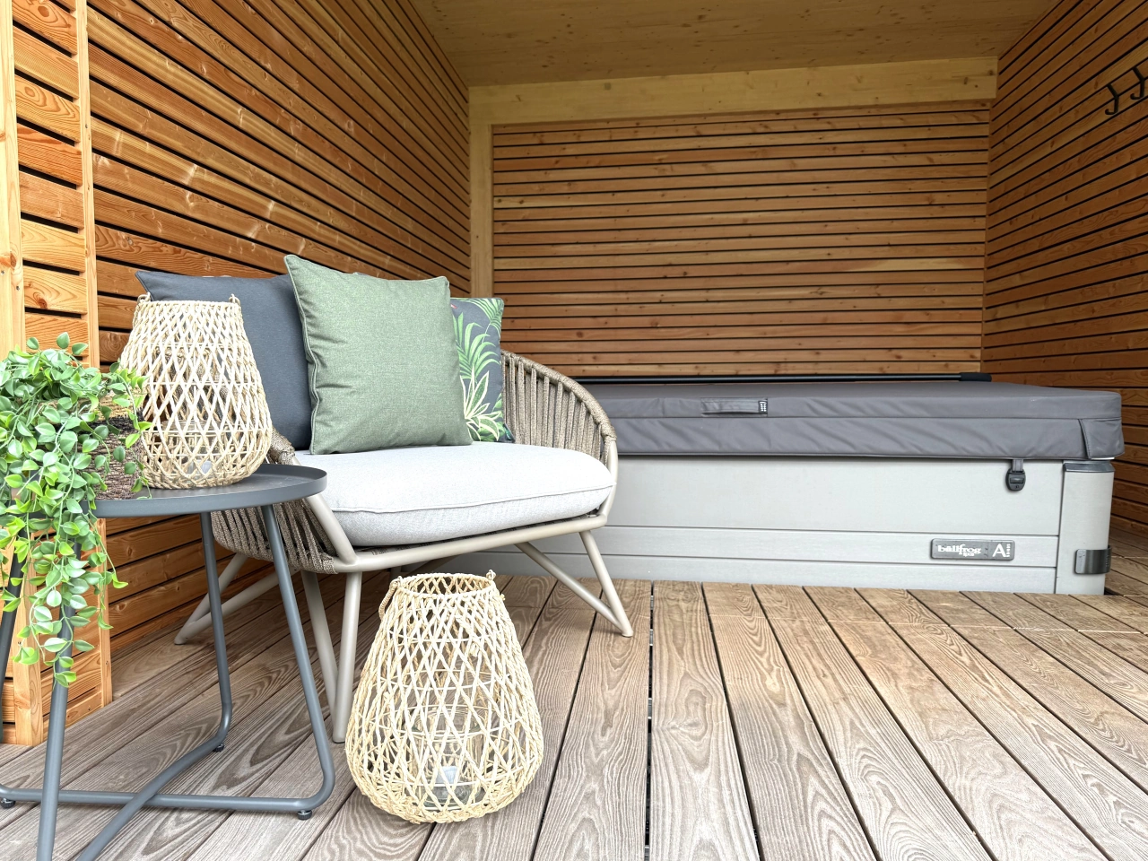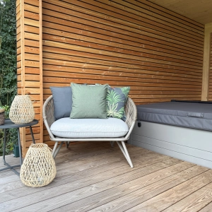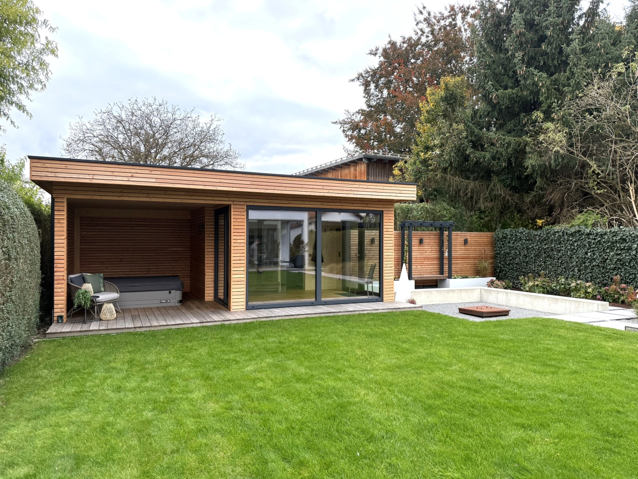 Saunahaus mit Whirlpool, Terrasse und Gartengestaltung